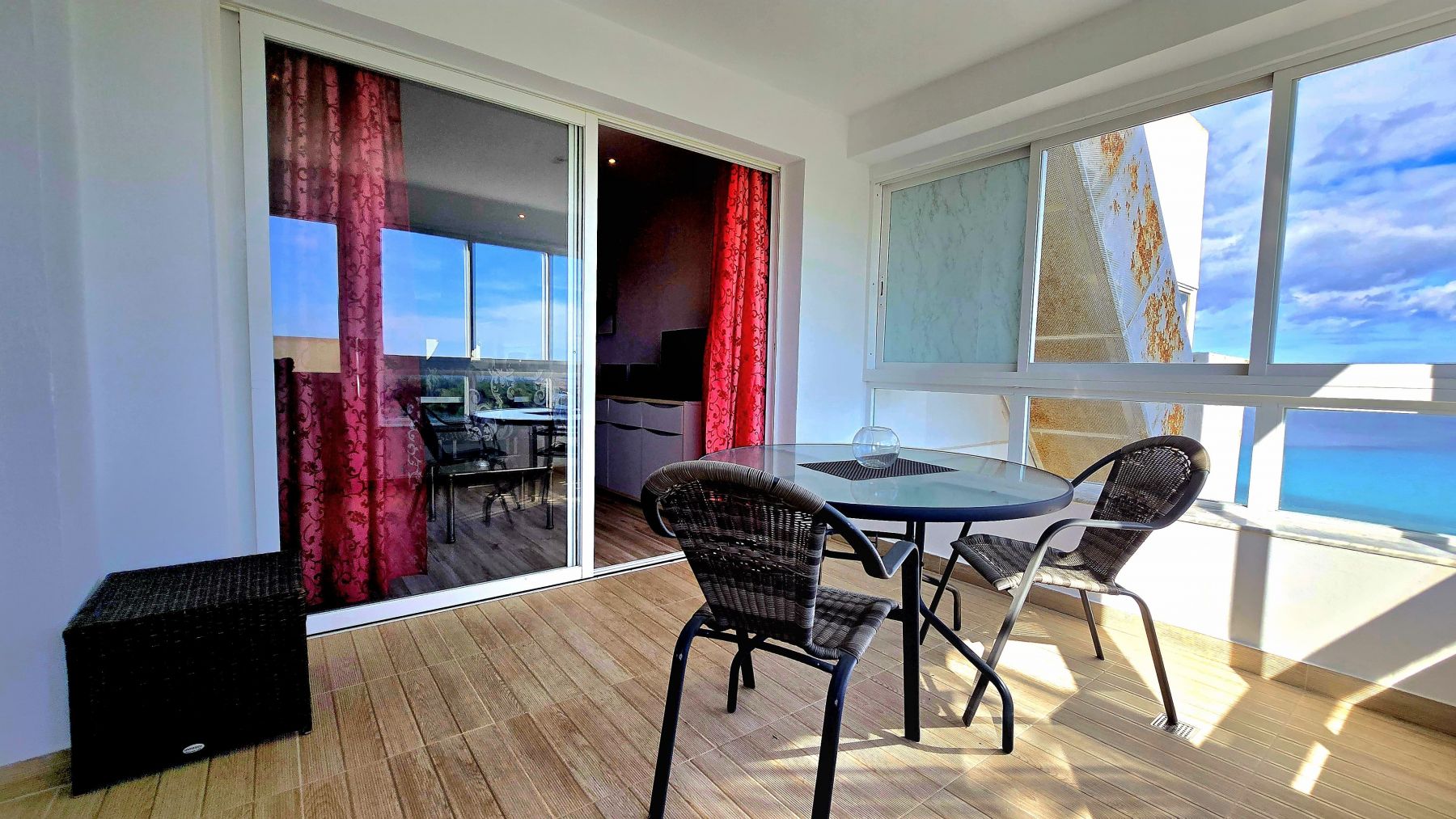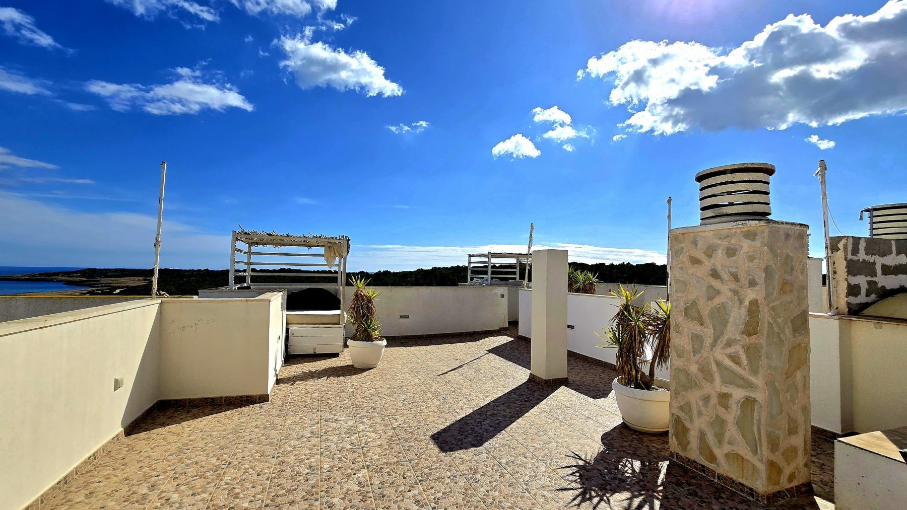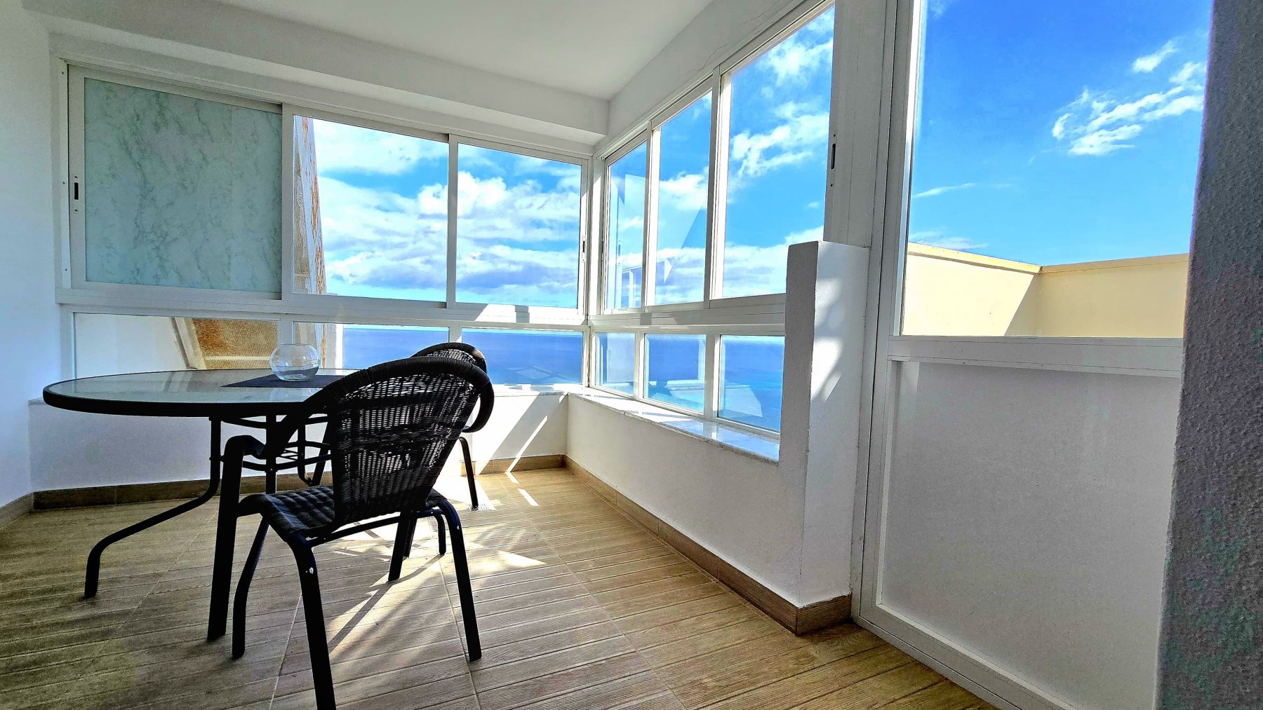 The penthouse is divided in living-dining room with an open-plan kitchen, fully furnished and equipped, two double bedrooms with built-in wardrobes, one complete bathroom with shower, and an enclosed porch with stained-glass and aluminum windows, with direct access via an exterior staircase to a spectacular private solarium of approximately 40m² with incredible sea views, and equipped with a barbecue, chill-out area, and shower.