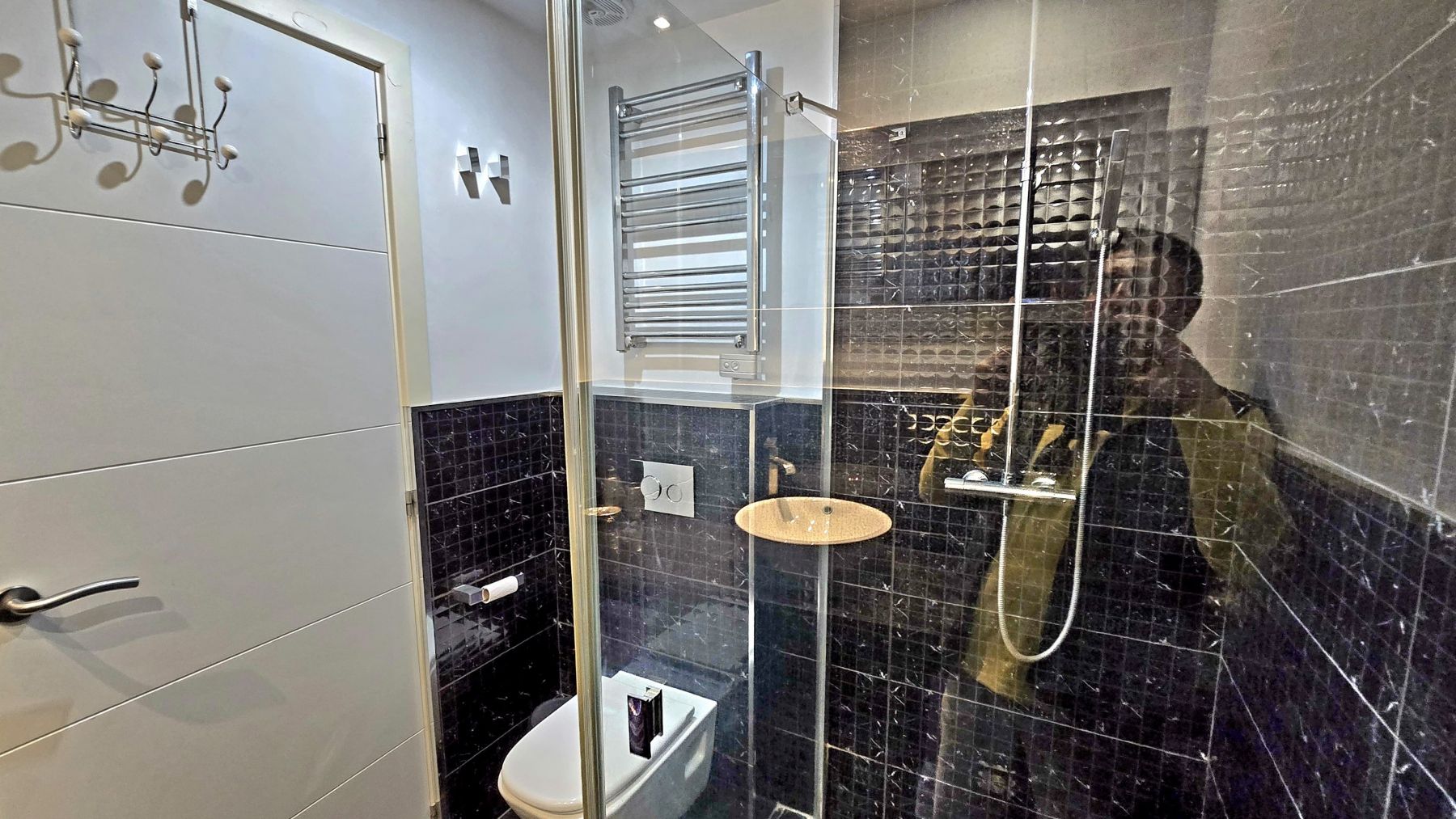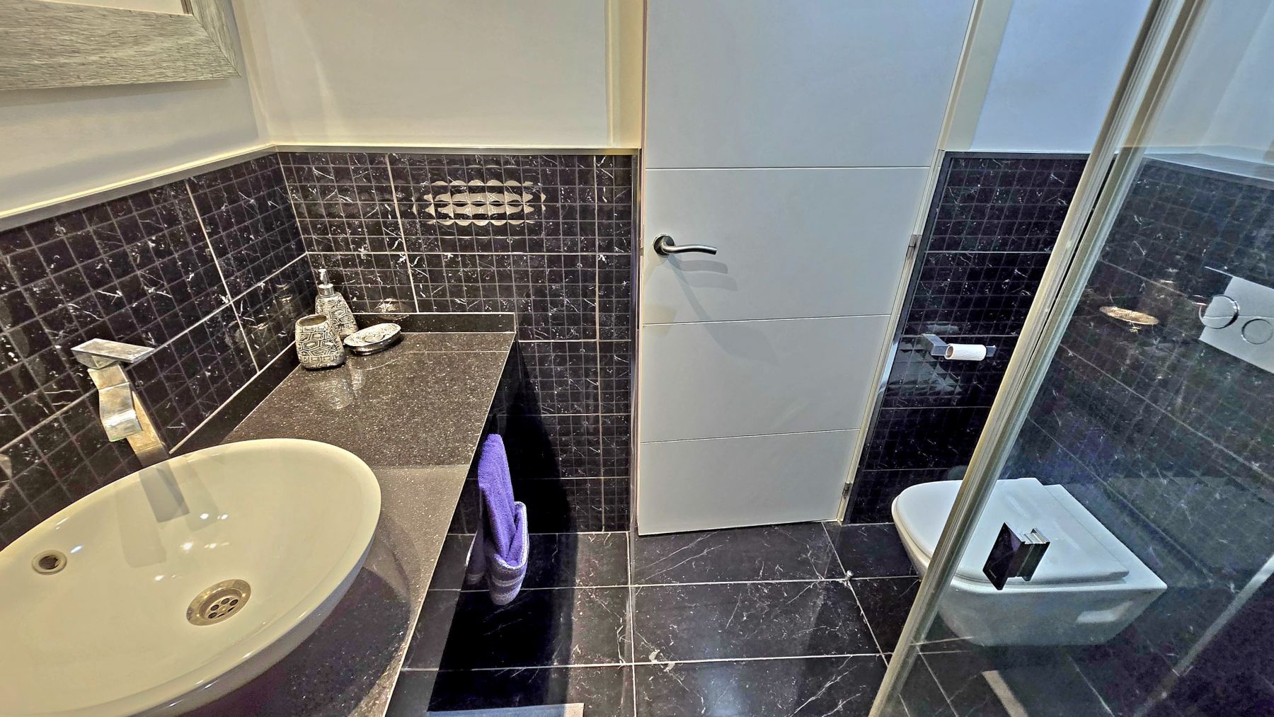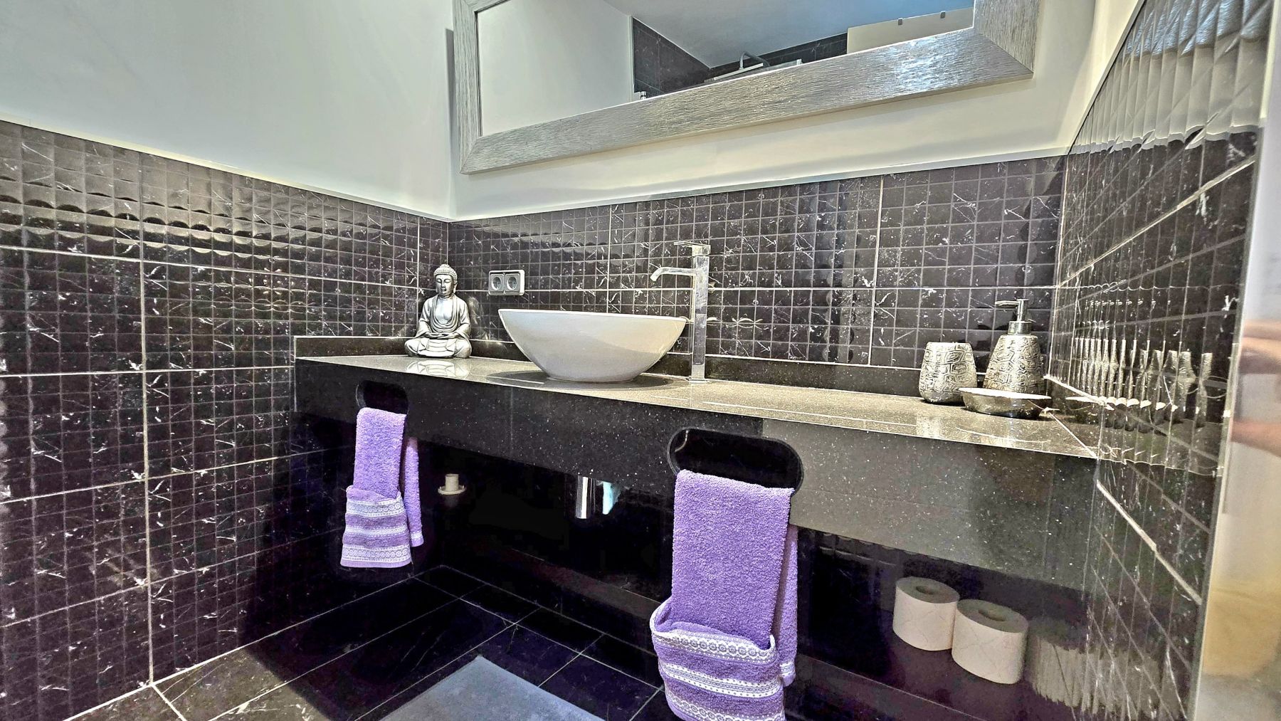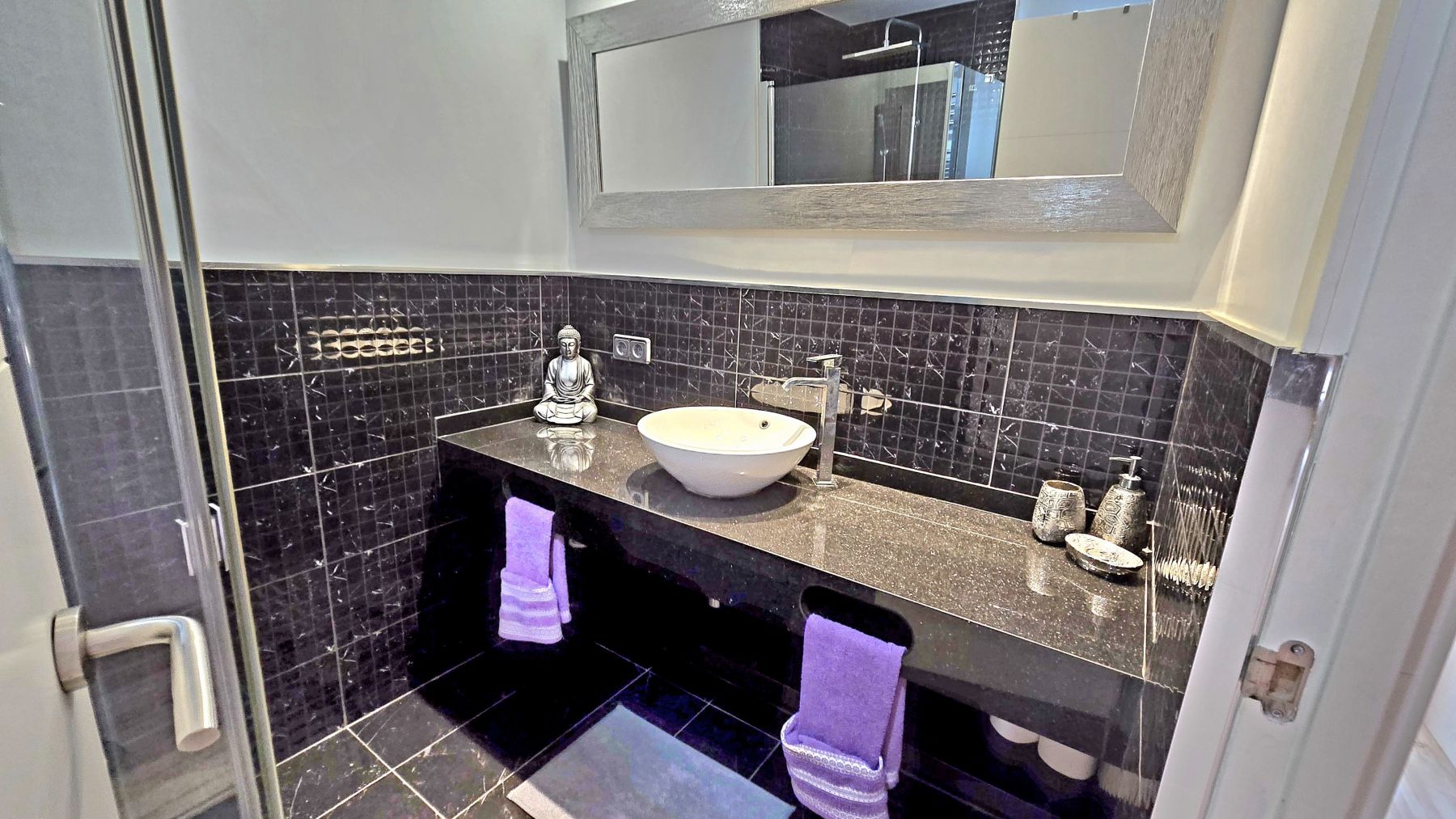 The penthouse is divided in living-dining room with an open-plan kitchen, fully furnished and equipped, two double bedrooms with built-in wardrobes, one complete bathroom with shower, and an enclosed porch with stained-glass and aluminum windows, with direct access via an exterior staircase to a spectacular private solarium of approximately 40m² with incredible sea views, and equipped with a barbecue, chill-out area, and shower.