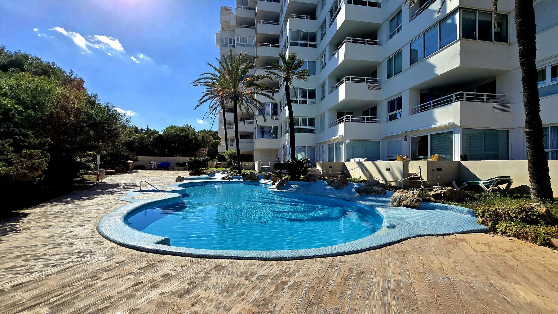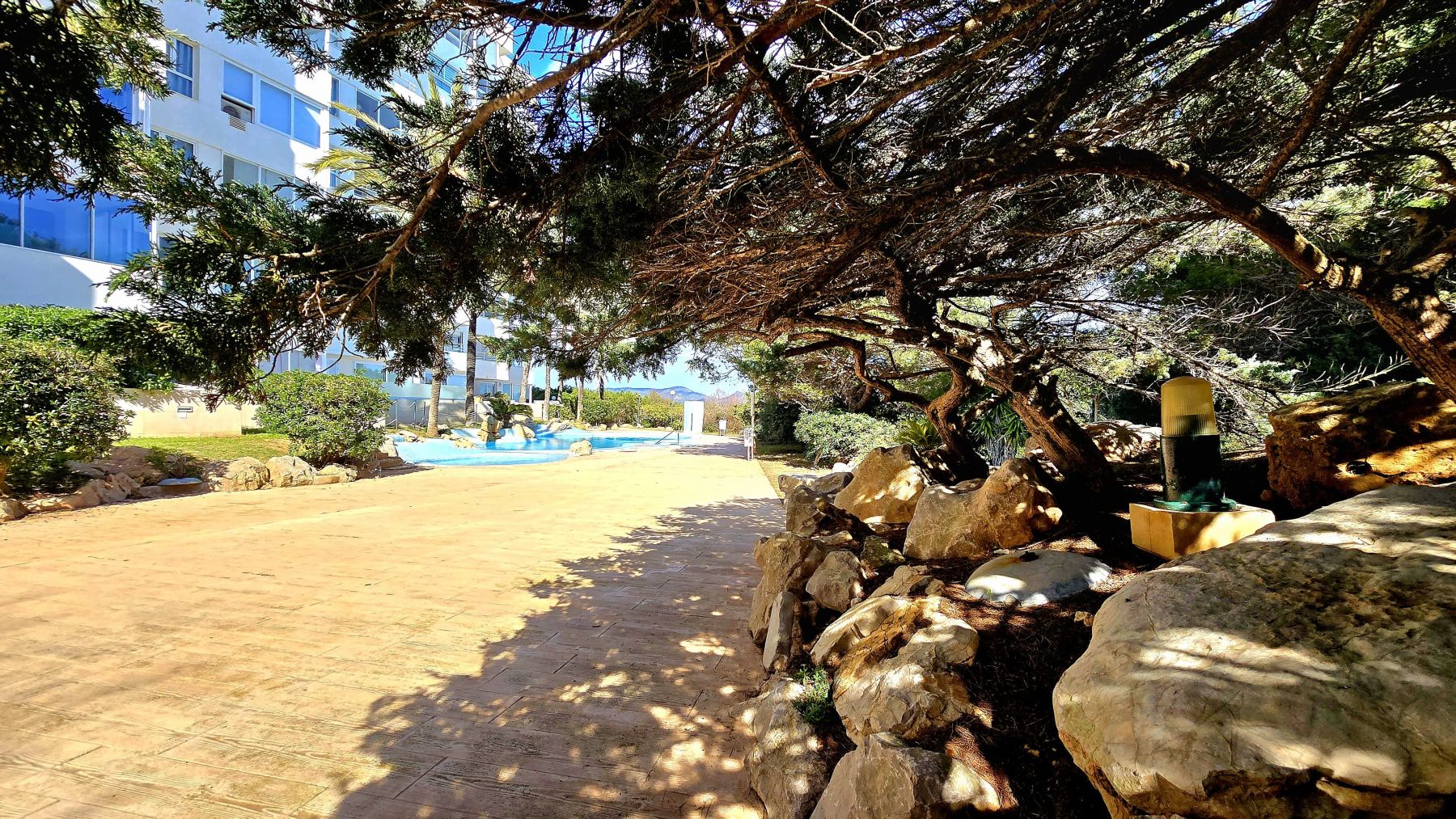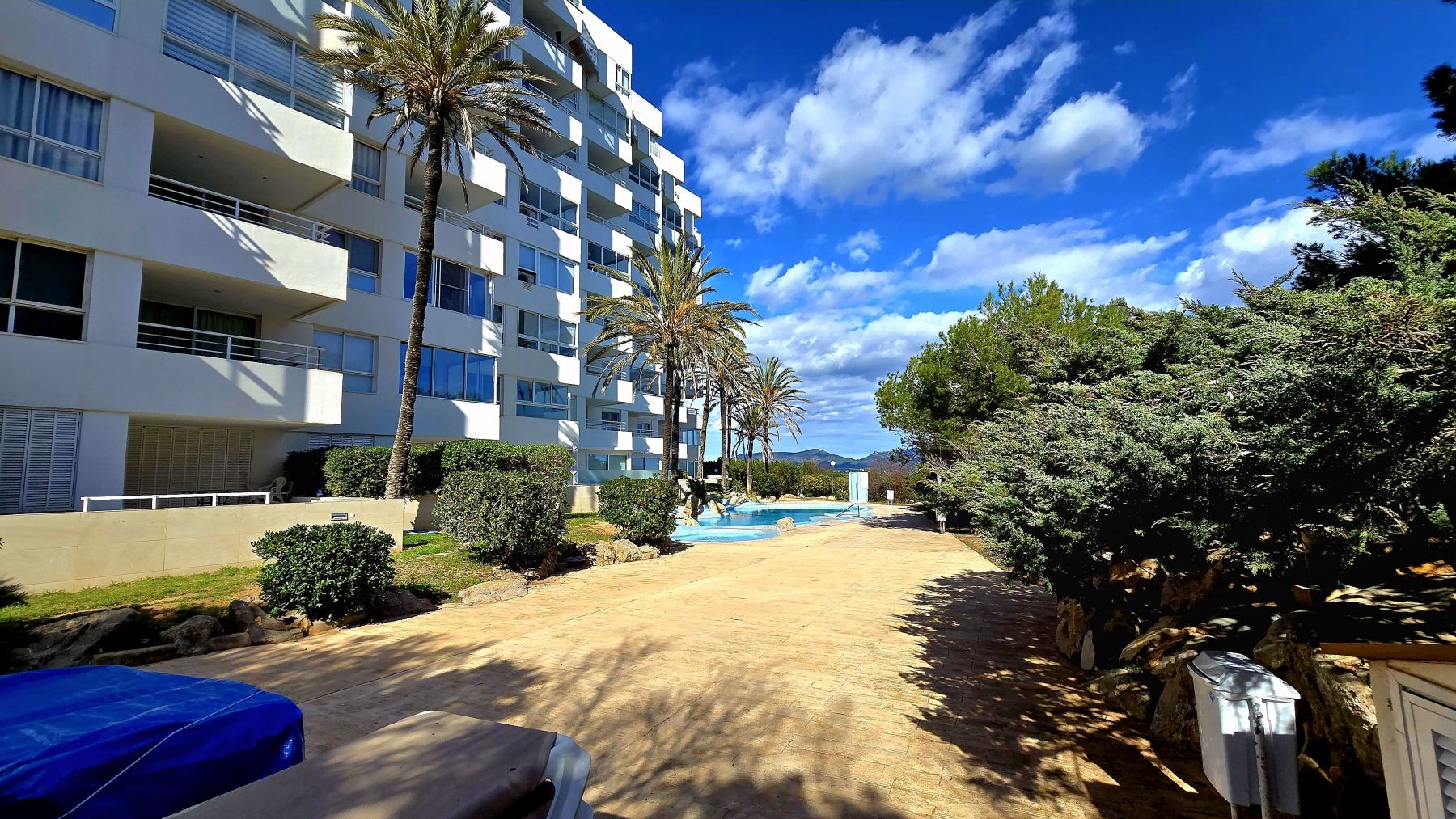 The apartment is located on ninth floor with elevator in a community complex with two swimming pools, one of them for childrens, and a garden area with native trees and some ornamental plants.
