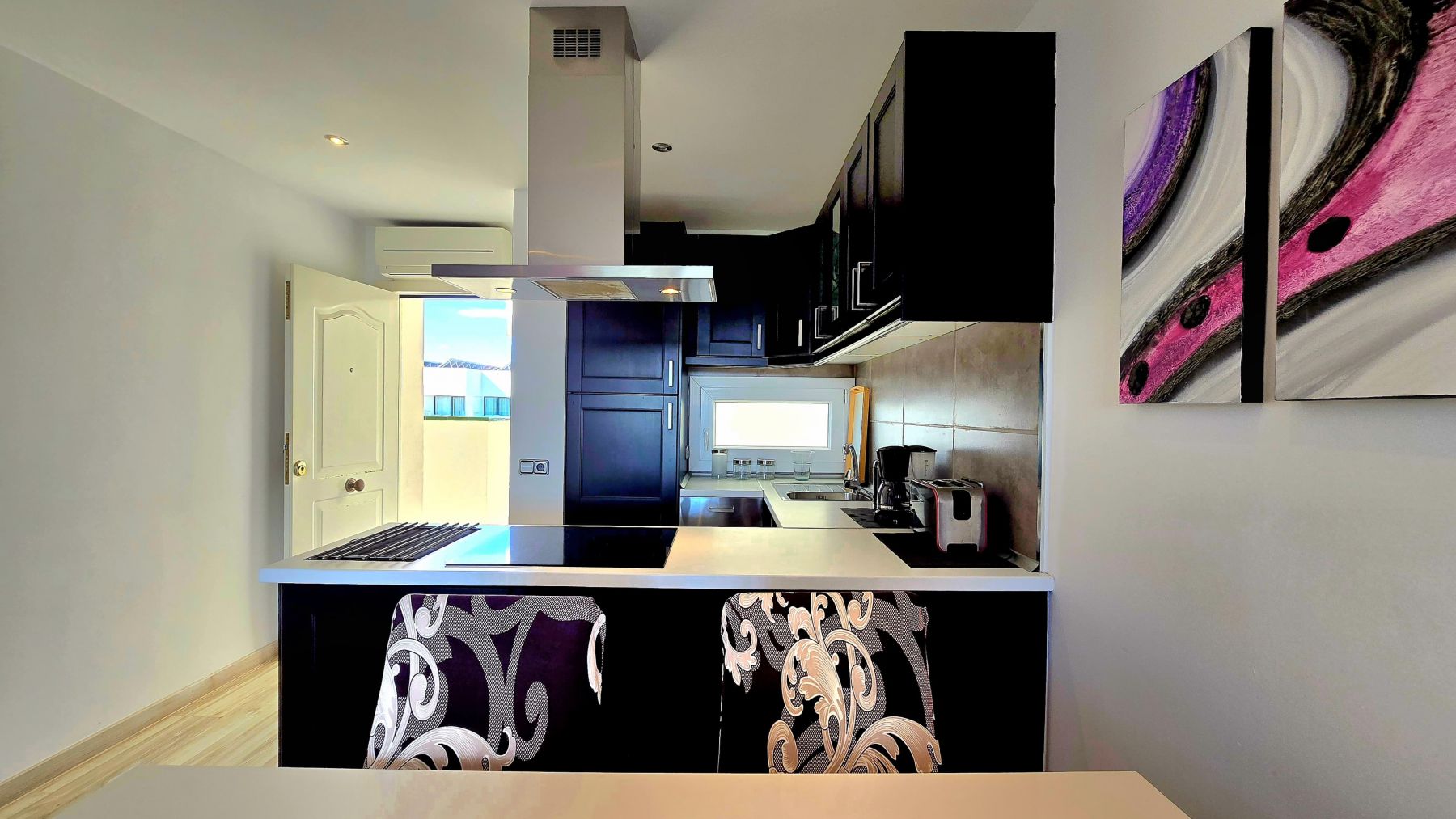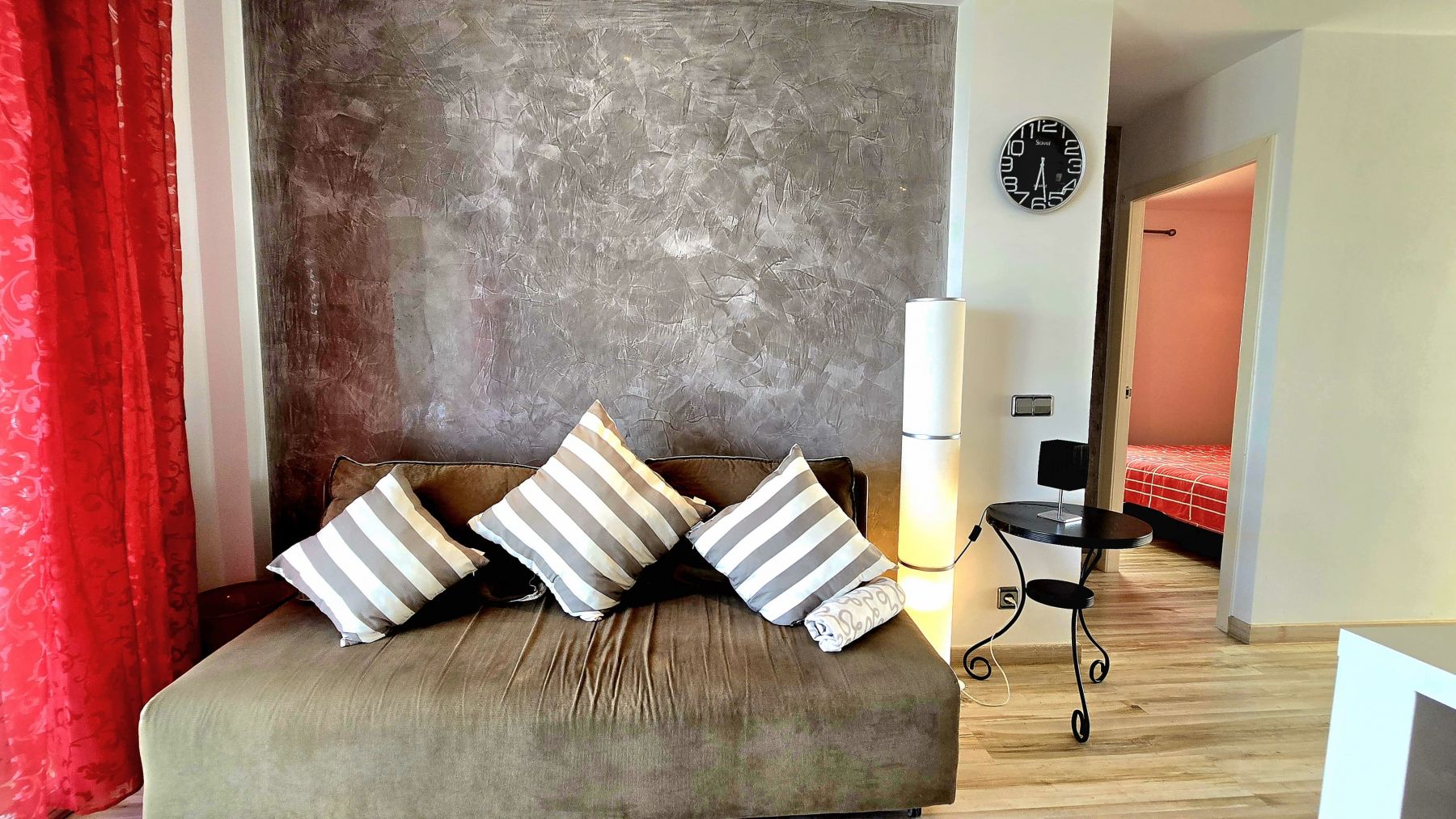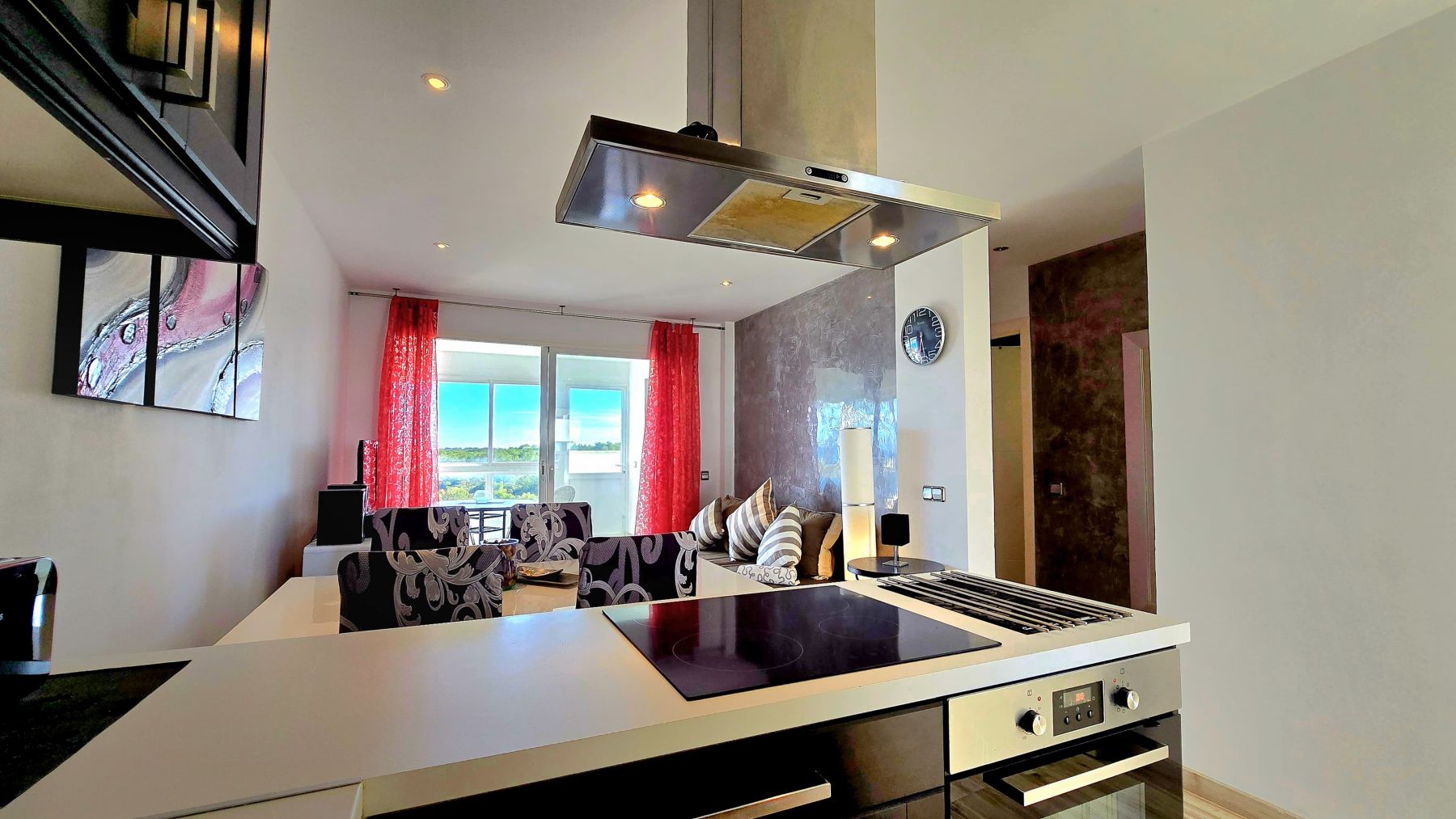 The apartment is located on ninth floor with elevator in a community complex with two swimming pools, one of them for childrens, and a garden area with native trees and some ornamental plants.