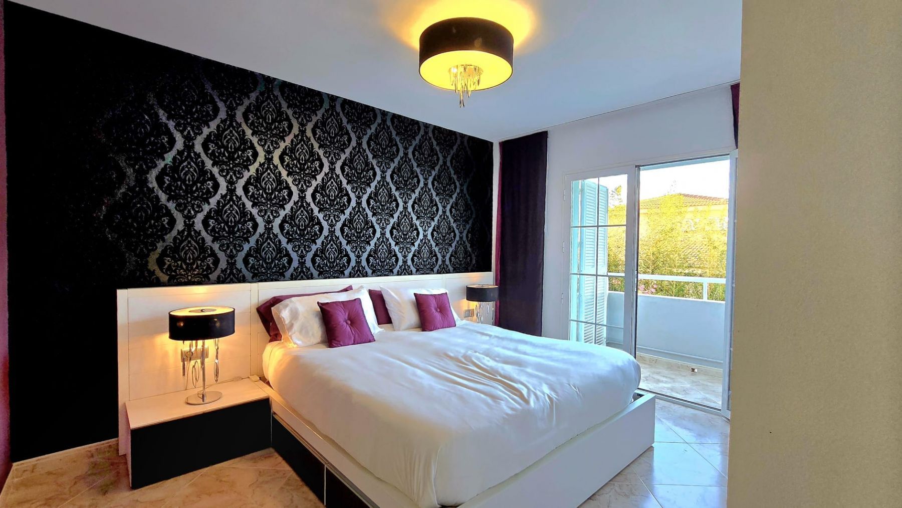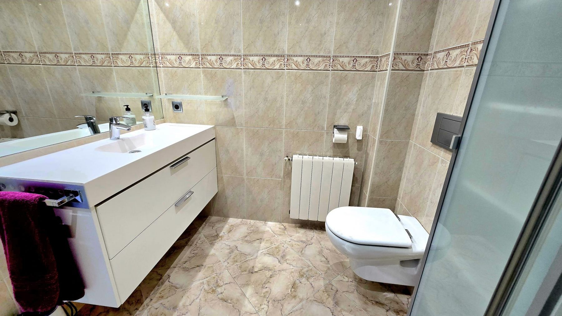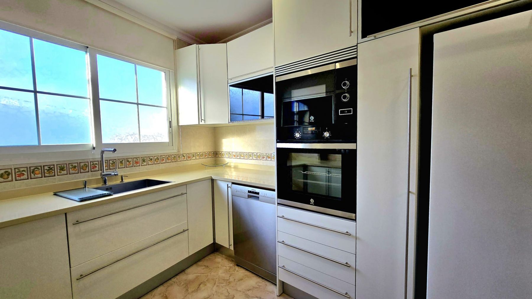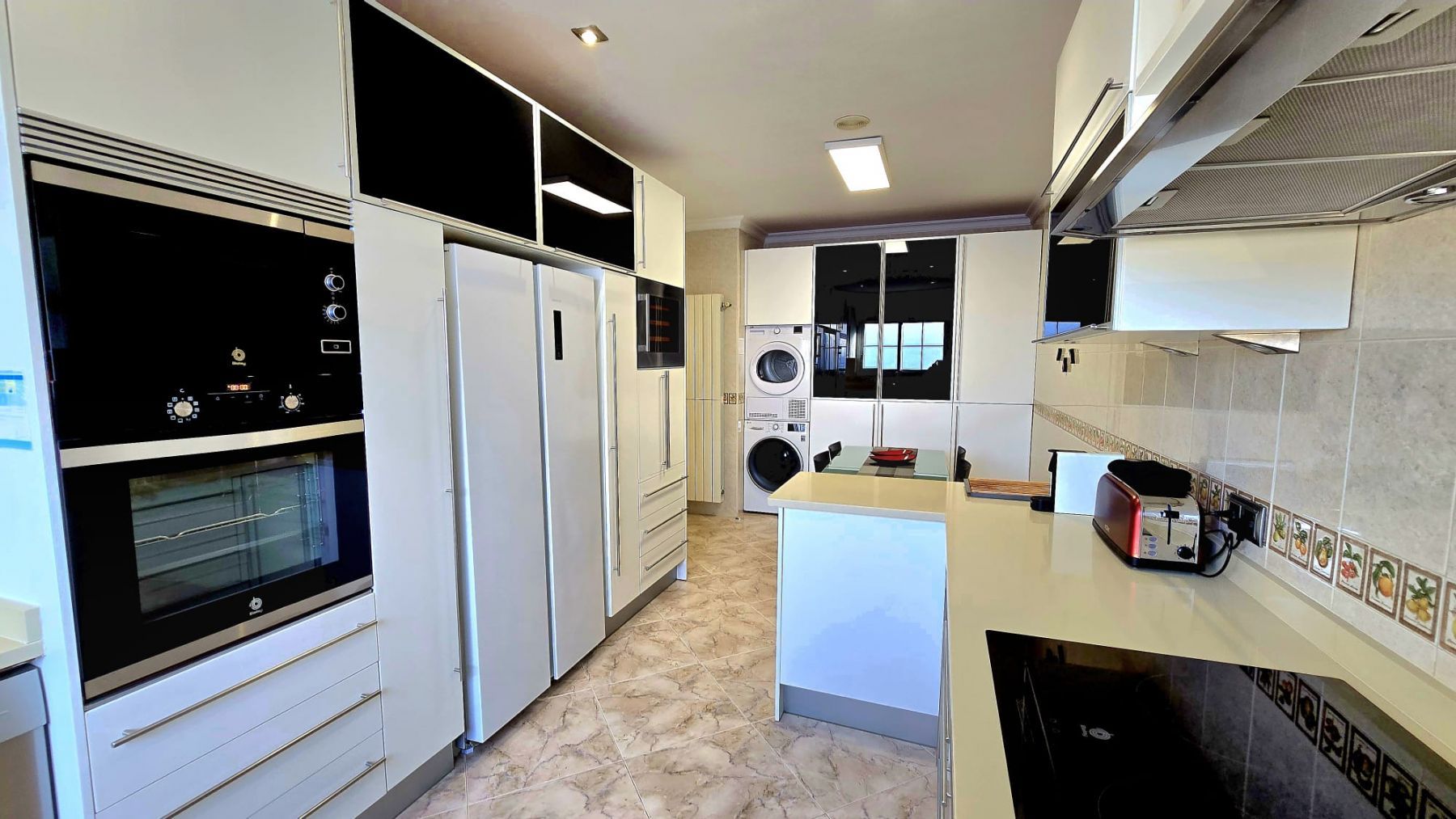 It features a spacious living-dining room, three bedrooms (the master bedroom has an en-suite bathroom and dressing room), two additional bathrooms, a fully furnished kitchen with appliances, and a balcony with unobstructed views.