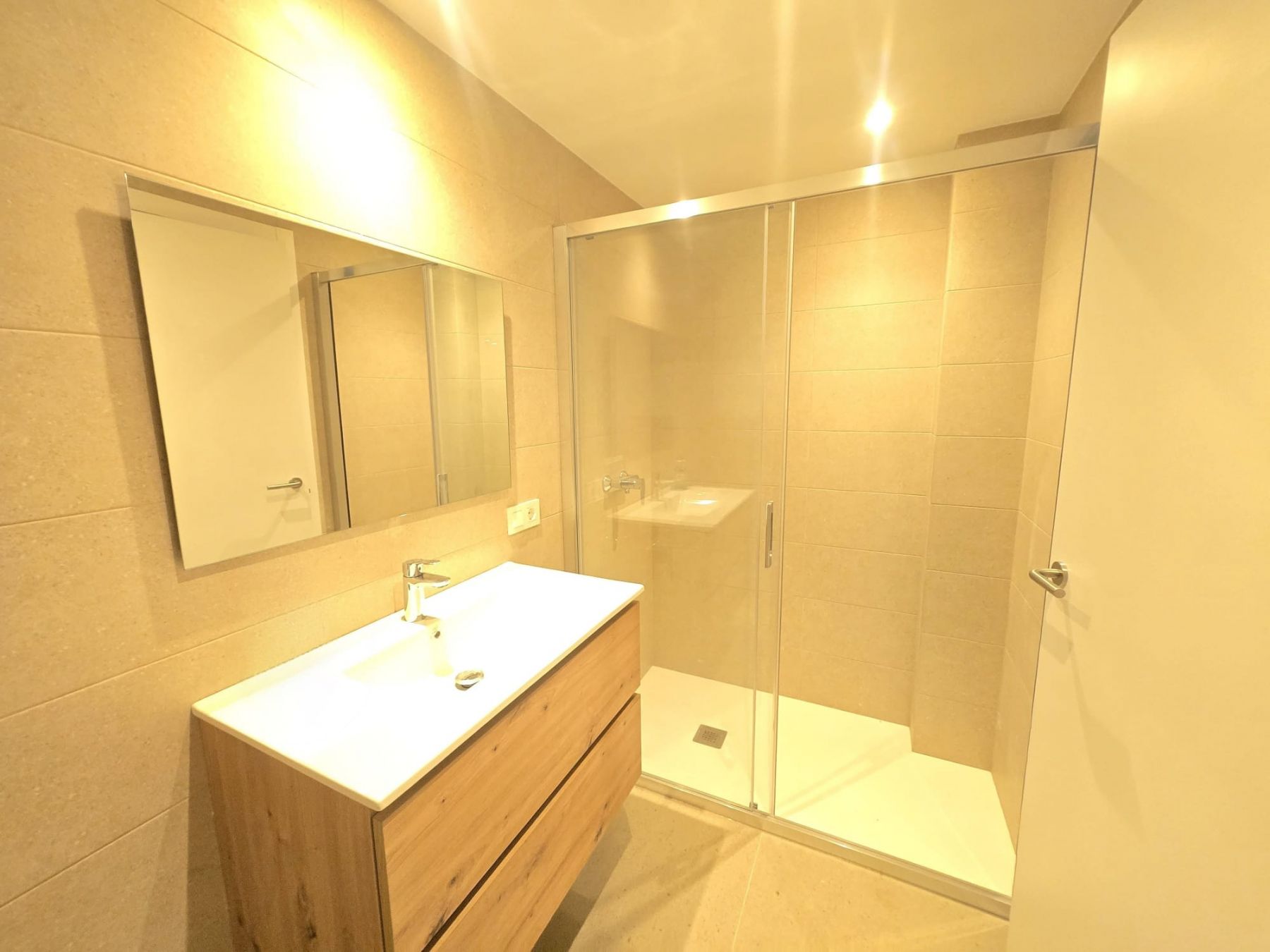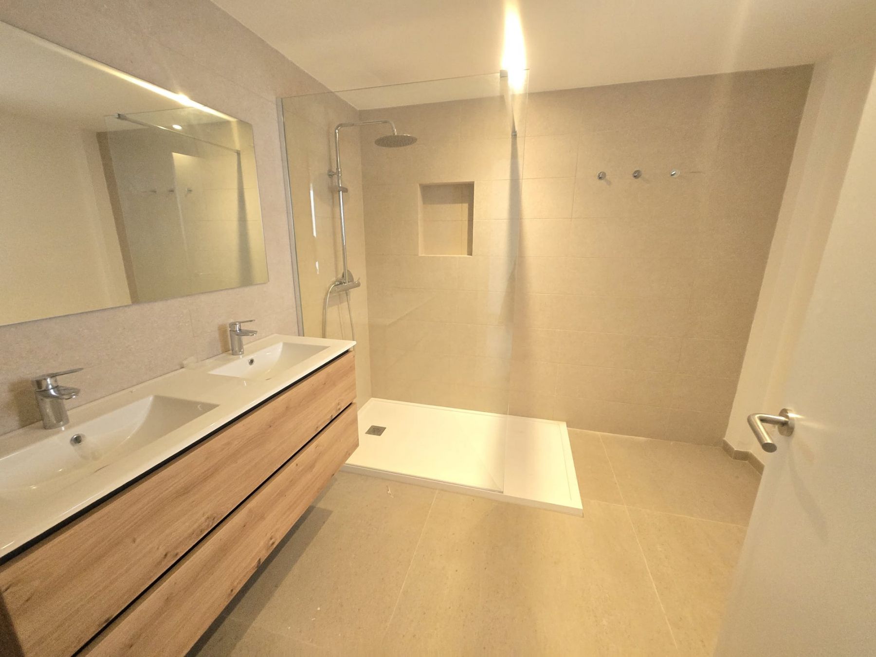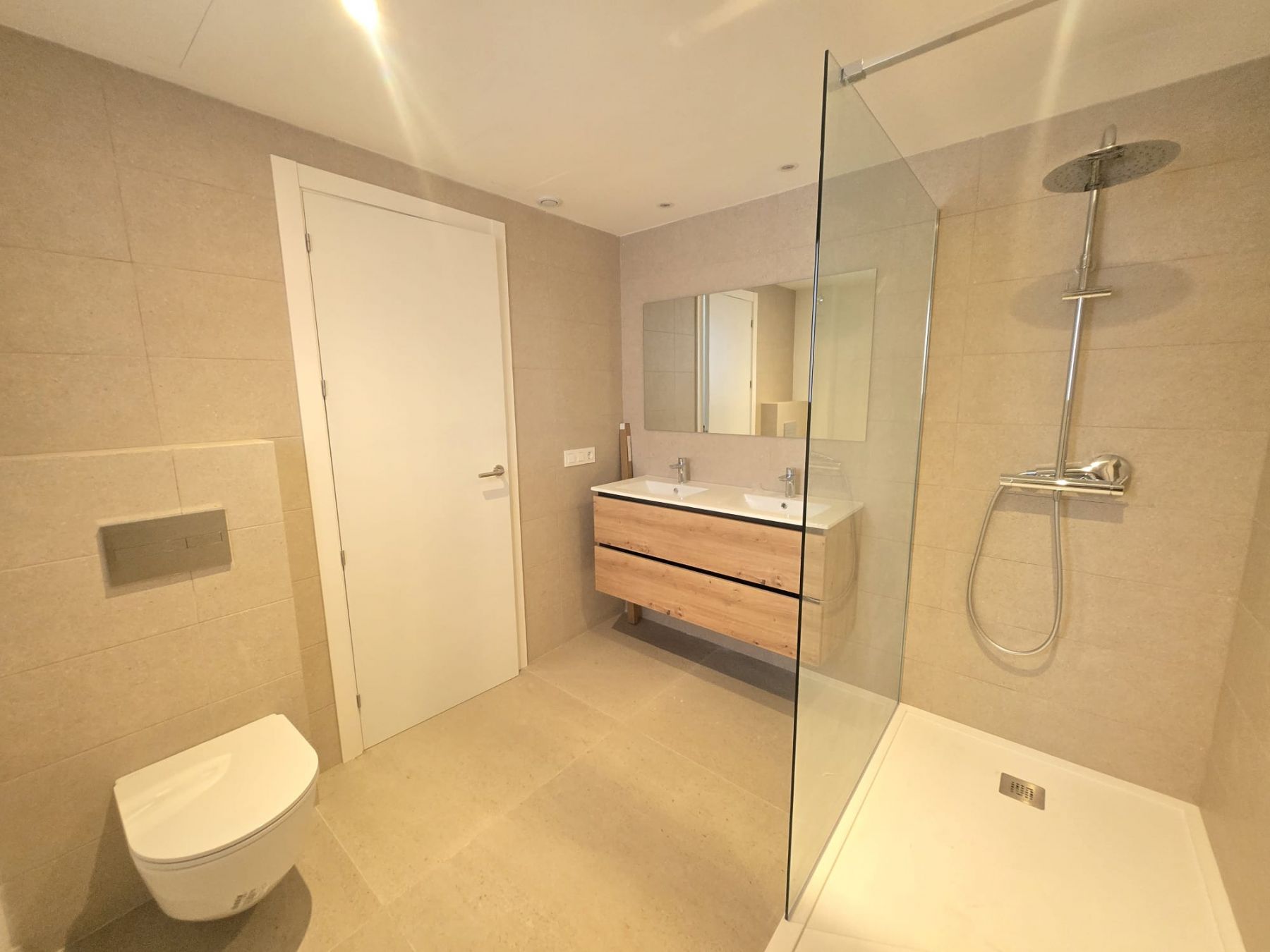 This brand-new property offers 100 m² of comfortable living space in a peaceful and harmonious community. It comprises an entrance hall, three double bedrooms with built-in wardrobes, two complete bathrooms (one en suite), living-dining room with an open-plan kitchen, and a large balcony with sea views. The building has an elevator, and a parking space is available.