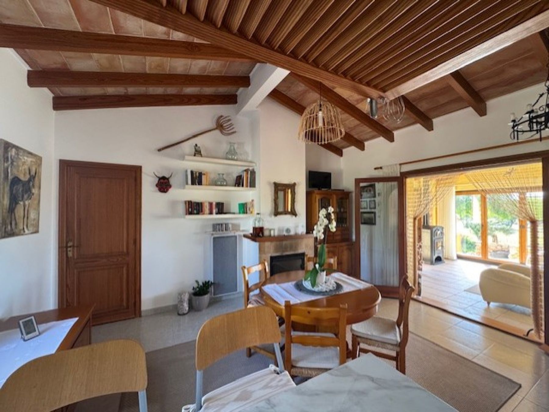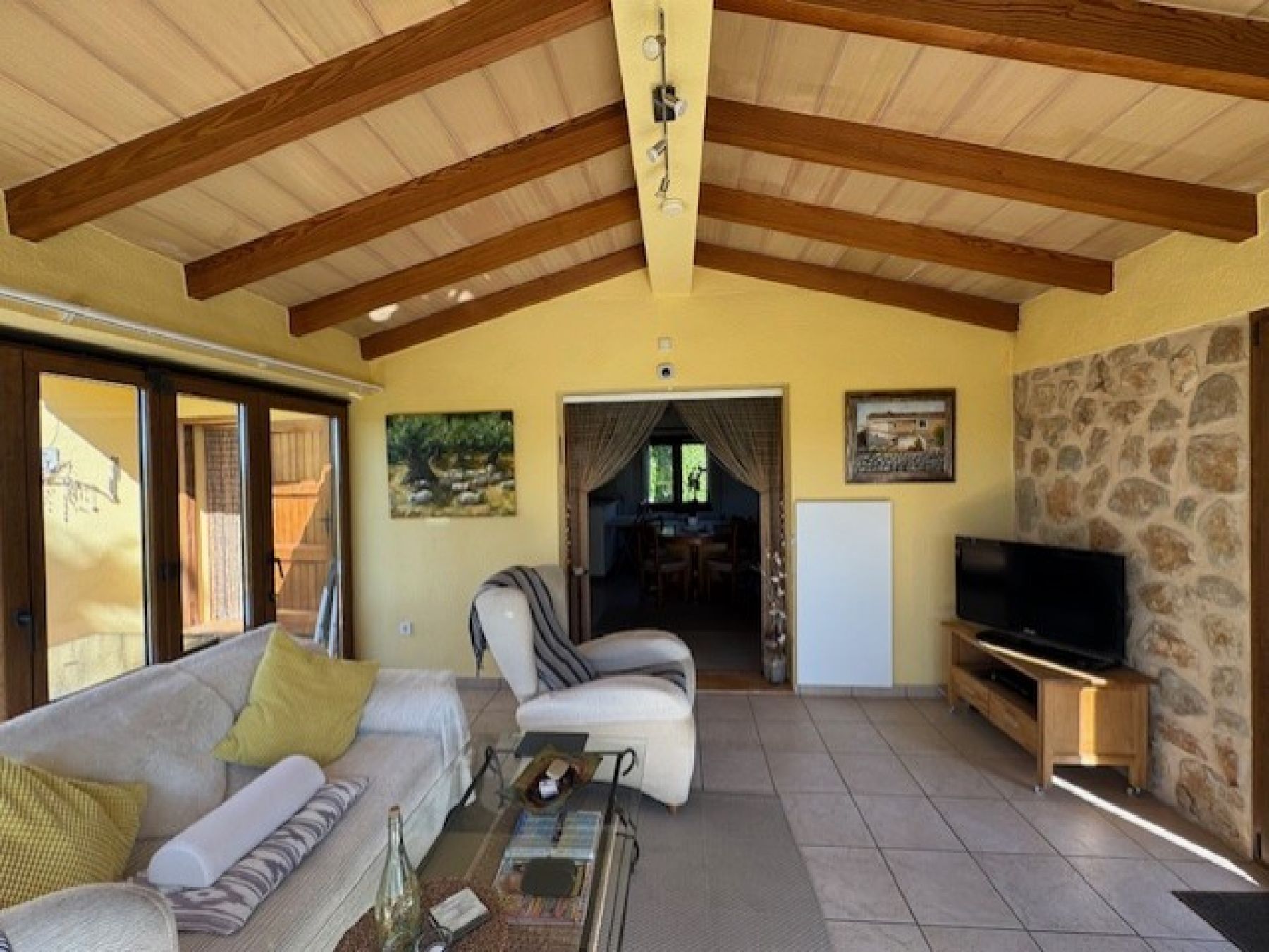 Das 2018 erbaute Haus verfügt über 120 m² gut aufgeteilte Wohnfläche. Es verfügt über zwei gemütliche Doppelzimmer, die mit Einbauschränken und Klimaanlage ausgestattet sind. Das Wohnzimmer mit seiner traditionellen offenen Küche ist das Herz des Hauses, mit Kamin und traditionellen Holzbalken, welche eine warme, rustikale Note verleihen. Das Wohnzimmer ist mit vollständig zu öffnenden Fenstertüren ausgestattet von dessen man einen atemberaubenden Blick auf das Meer hat.